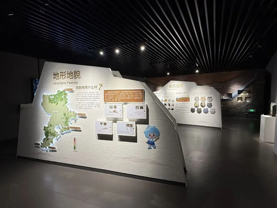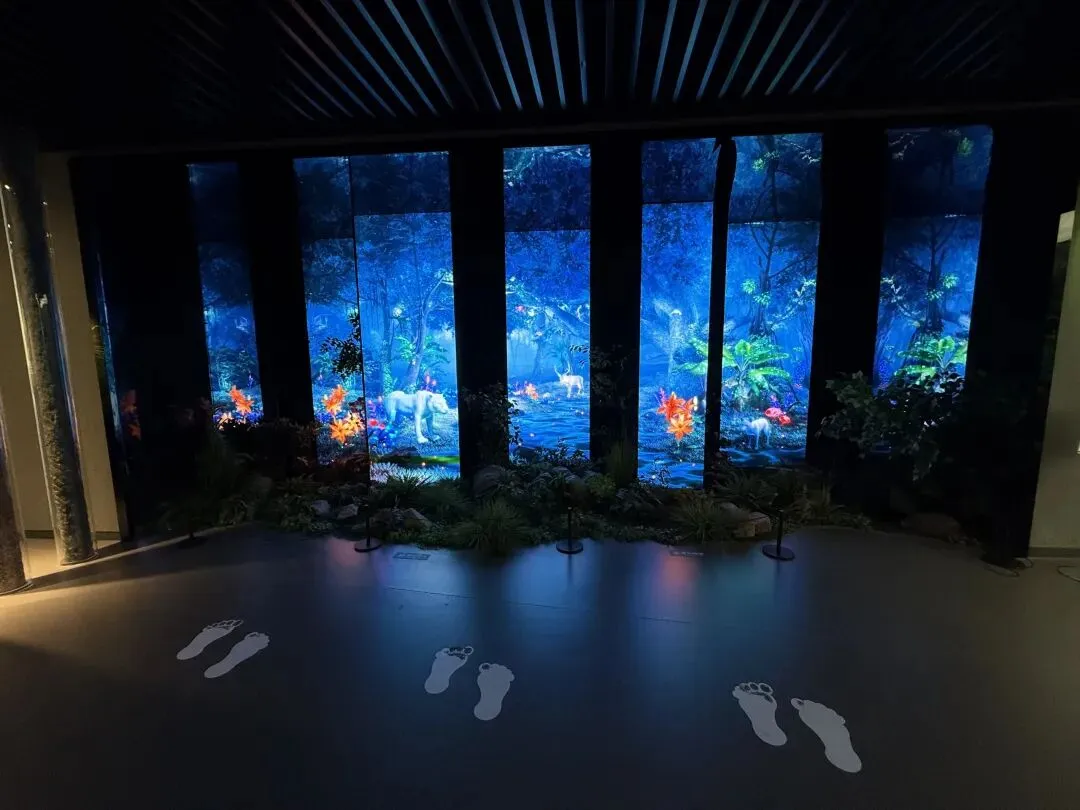 别看展馆只有两层,内容却丰富到让你逛到脚软。一层是自然资源科普展厅,主打一个沉浸式体验。一进门就能被各种互动艺术装置吸引,这里把青岛的海洋、森林、湿地搬进了馆内,站在感应区,脚下就会“生长”出绿植,挥手间仿佛能掀起一阵“海浪”。
