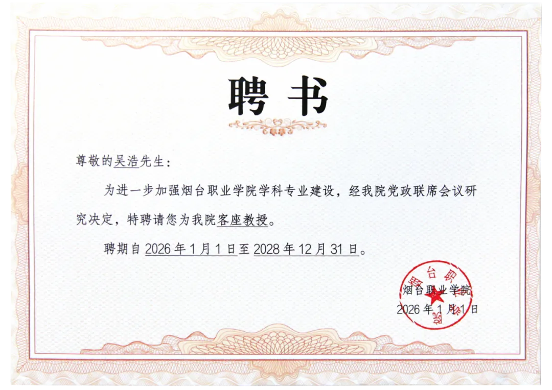 近日,传感器行业的领军人物、GRAEFF(格拉夫)总裁吴浩博士正式受聘为烟台职业学院客座教授,聘期为 2026 年 1 月 1 日至 2028 年 12 月 31 日。此次受聘,是学院推动产教深度融合、强化学科专业建设的重要举措,既是学校对吴浩博士在传感器领域深厚的技术积淀、前沿产业实践成果与行业影响力的高度认可,也彰显了 GRAEFF(格拉夫)作为行业领军企业的技术领先性与产教融合价值,将以产业专家资源为学校学术研究与人才培养注入强劲动能。