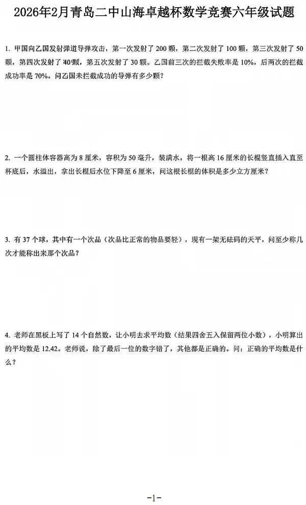 2026年2月青岛二中山海卓越杯数学竞赛六年级试题
