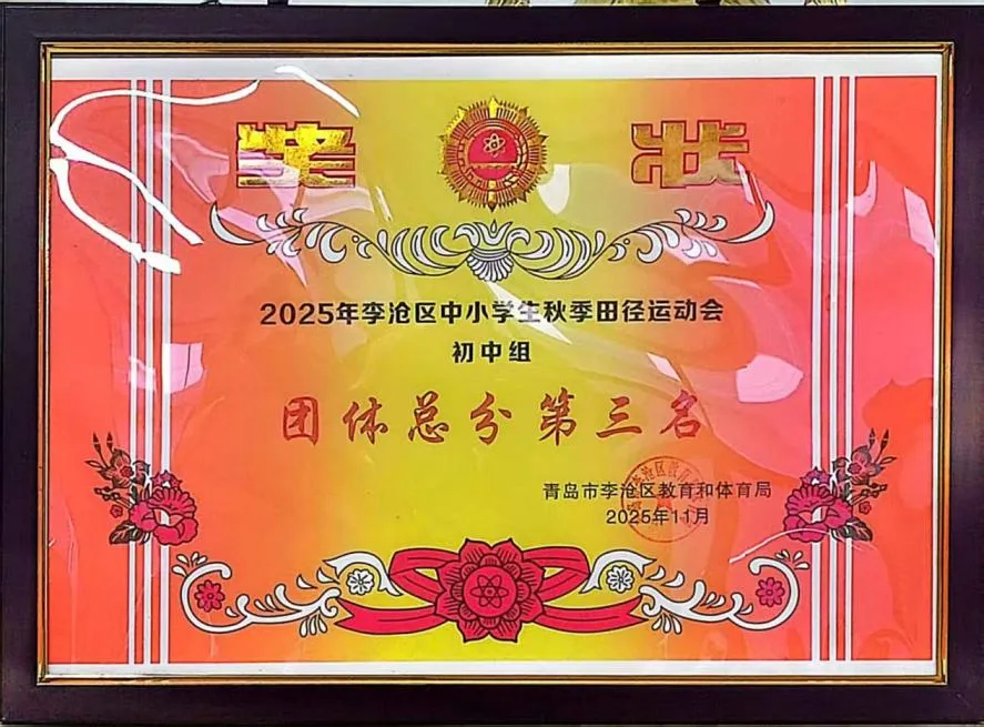 特色教育硕果累累:李沧区艺术节戏剧朗诵一等奖第1名并晋级市级展演获一等奖,10余名学子在区级书法绘画比赛中获奖,班级合唱获区级一等奖;女篮斩获区级冠军、男篮获季军,学校获区运会团体总分第3名,啦啦操队获市级第6名,体质监测成绩优异,学校获评“山东省武术进校园试点学校”。