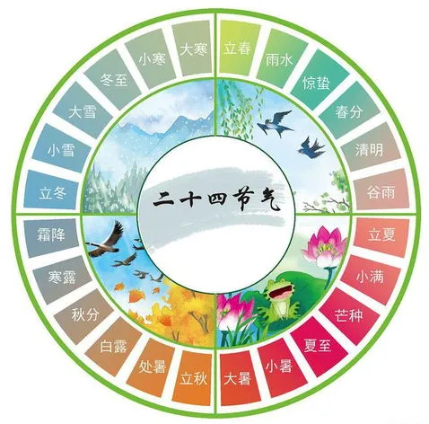二十四节气依次为:立春、雨水、惊蛰、春分、清明、谷雨、立夏、小满、芒种、夏至、小暑、大暑、立秋、处暑、白露、秋分、寒露、霜降、立冬、小雪、大雪、冬至、小寒、大寒。
