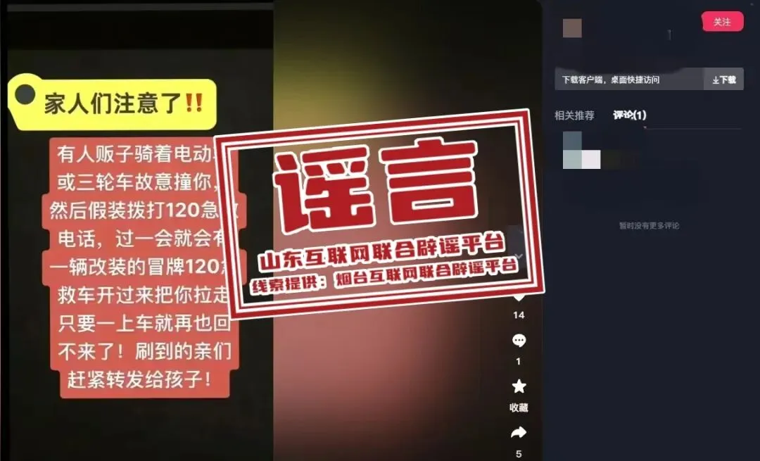 近日,网上多个短视频平台有网民发布“烟台市某商场有陌生人给他人孩子录像”“有人贩子骑着电动车或三轮车故意撞人,假装拨打120急救后,冒牌120急救车会把人拉走”等信息,引发舆论关注。经公安机关核实,以上信息均为不实信息。