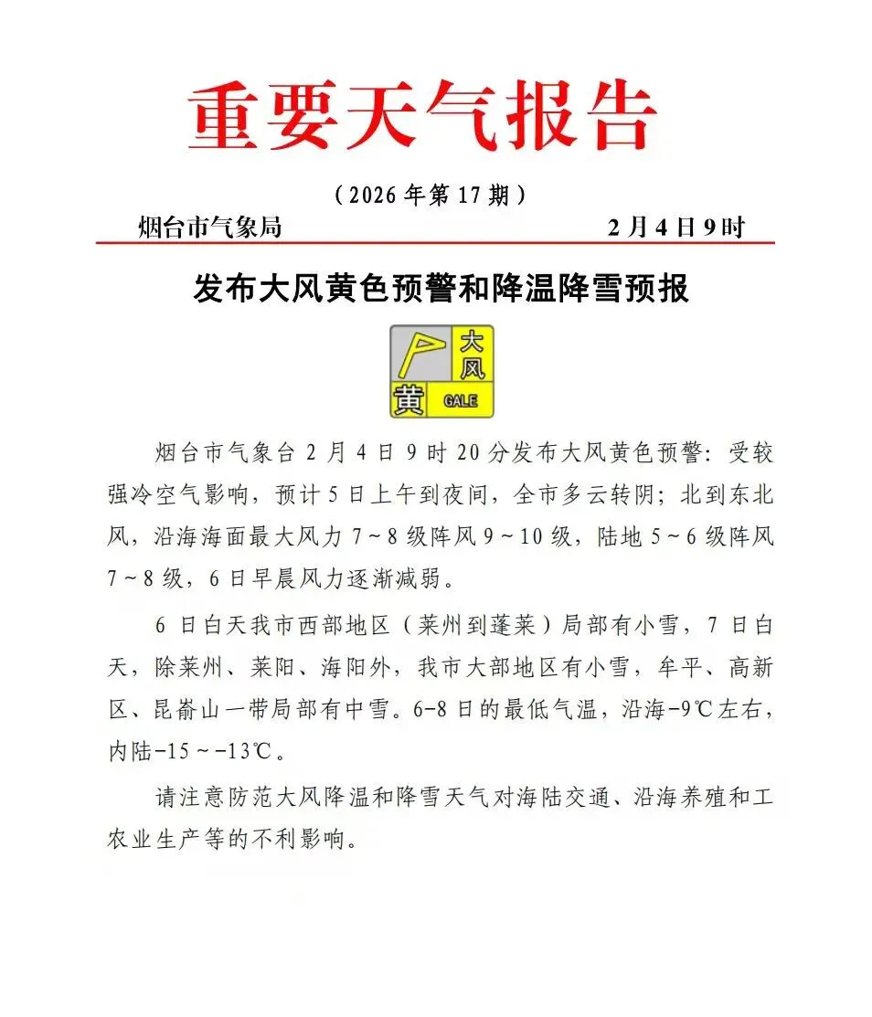 烟台市气象台2月4日9时20分发布大风黄色预警:受较强冷空气影响,预计5日上午到夜间,全市多云转阴;北到东北风,沿海海面最大风力7~8级阵风9~10级,陆地5~6级阵风7~8级,6日早晨风力逐渐减弱。