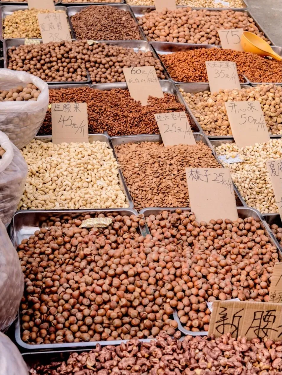 花生、瓜子、糖果等干果零食的摊位前,总是不缺少顾客,他们熟络地挑起几颗果子试吃,为的是给春节走访的亲戚挑选出最可口的小零嘴儿~每一兜“战绩”,都是沉甸甸的幸福。