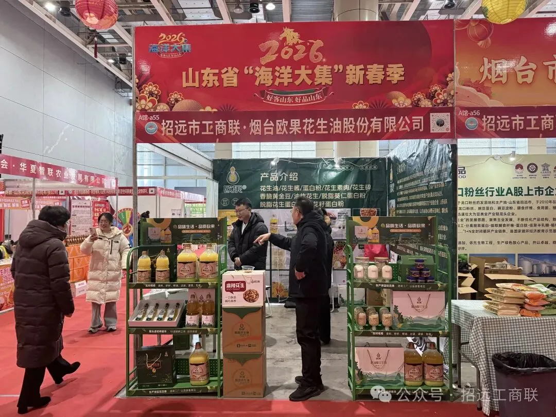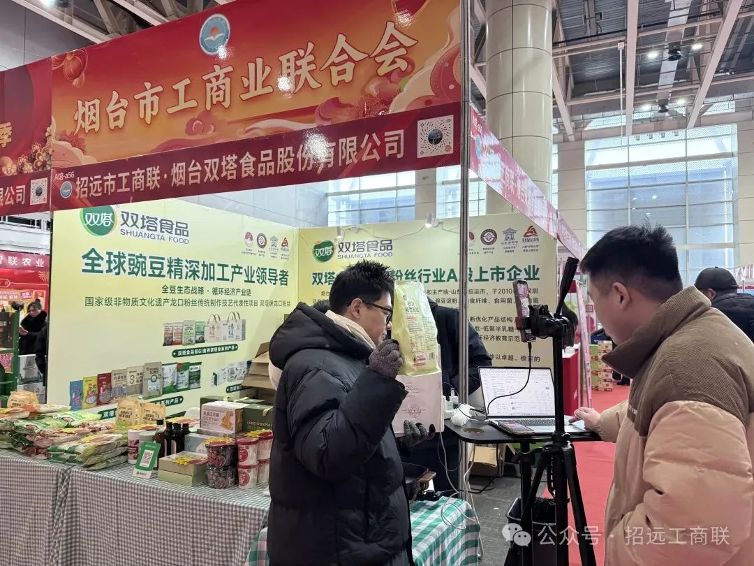 1月31日至2月11日,“2026烟台新春年货会”在烟台国际博览中心举行。招远市工商联积极组织十家优秀企业集中参展,涵盖玲珑集团、双塔食品、欧果花生油等知名品牌,以及大安电子、华新通讯等科技企业,其中华新通讯荣获A馆首日销售冠军,大安电子获得2月3日销售冠军,展现出强劲的市场吸引力。同时,九顶原乡医养、建新合作社、安惠生物、岁穗粮等带来的健康产品也精彩亮相,充分展现了招远产业的多元特色。