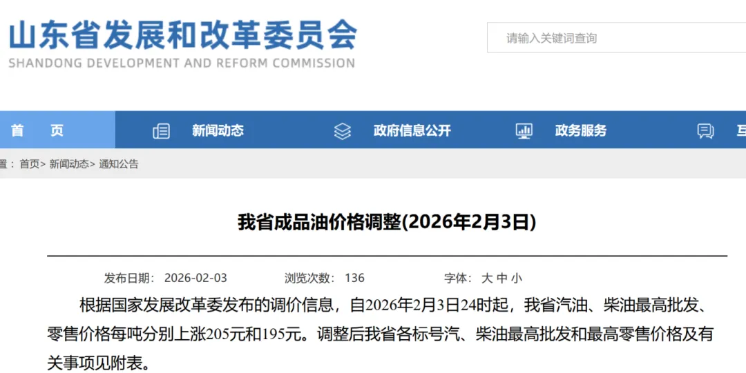 根据国家发展改革委发布的调价信息,自2026年2月3日24时起,我省汽油、柴油最高批发、零售价格每吨分别上涨205元和195元。调整后我省各标号汽、柴油最高批发和最高零售价格及有关事项见附表。