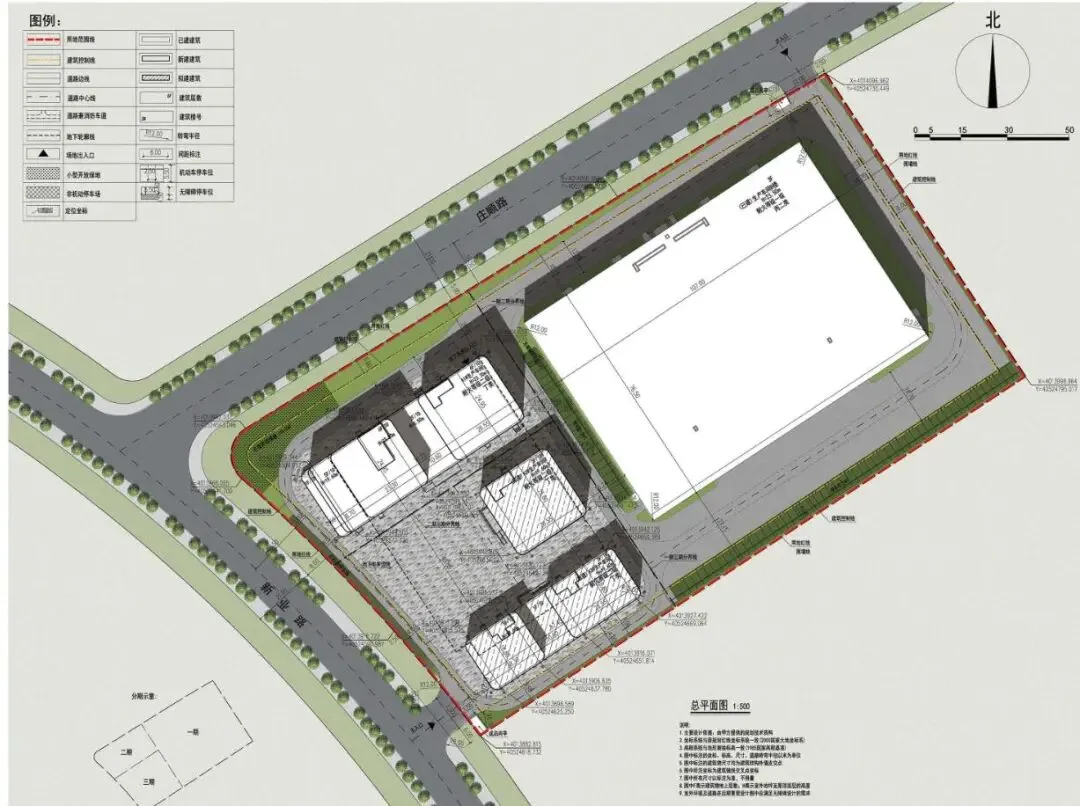 项目用地为一类工业用地M1,总用地面积26666.5㎡,总建筑面积45703.61㎡,新建A1生产车间,拟建A2生产车间、A3生产车间,地下建筑面积4686.2%,容积率1.853,建筑密度44.1%,绿地率8.6%,停车位175个。