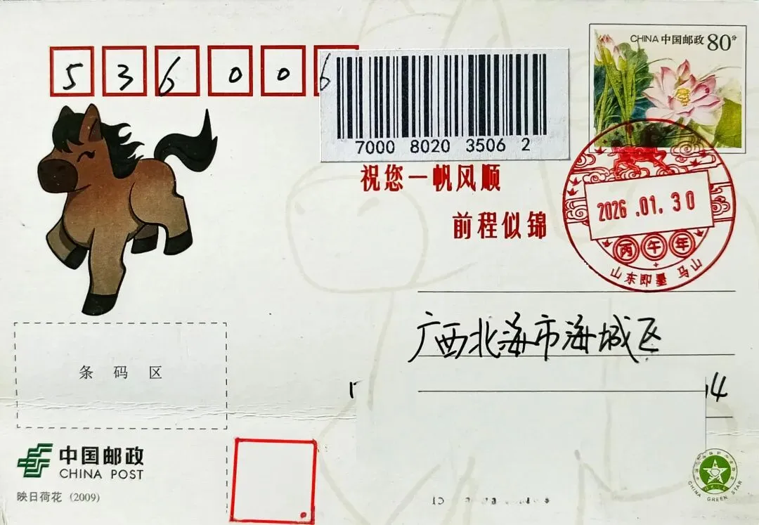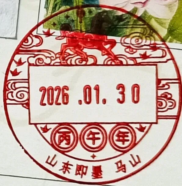 明信片是于先生寄自青岛马山邮政支局的,销票戳为邮政集团有限公司统一制作的丙午年新春文化日戳。邮戳下环的地名、机构名称与该支局的普通日戳地名、机构名称一致,且文化日戳的使用地点与普服网点也是一致的,理论上说,无需再加盖普通日戳。但文化日戳缺少时点字钉,无法明确封发频次。