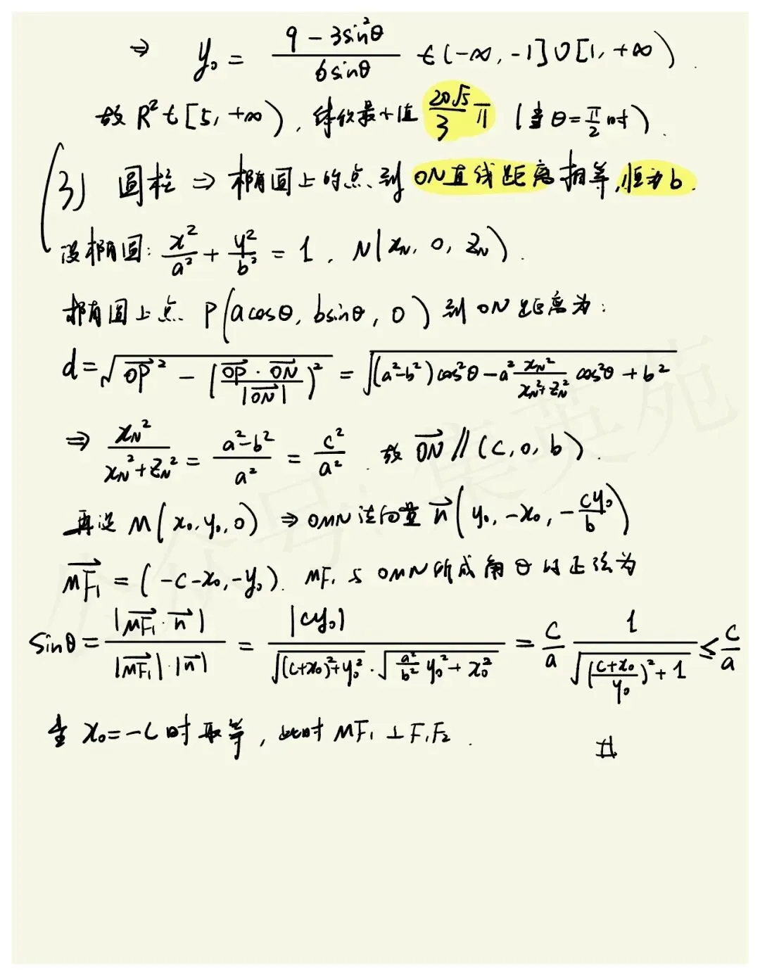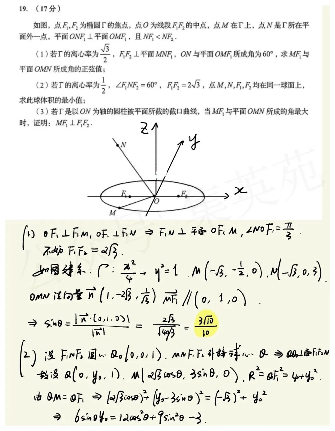 19题圆锥曲线和立体几何结合,三问没啥关联,做起来倒也不算棘手,反正全都可以建系爆算。第三问注意一下ON与椭圆平面夹角 与离心率之间隐藏的关系即可,还是丹德林双球的模型。熟悉立体模型的同学,甚至可以从几何法入手,不过我认为建系还是很快的。