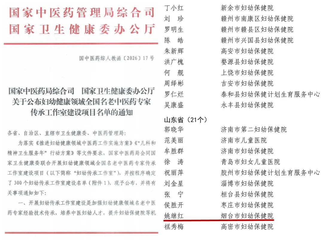 近日,国家中医药管理局、国家卫生健康委联合发文公布2025年妇幼健康领域全国名老中医药专家传承工作室建设项目名单,烟台市妇幼保健院“姚继红名老中医药传承工作室”成功上榜,这是医院继获评国家级妇幼中医药特色建设单位之后,再次斩获的国家级妇幼中医药建设项目,烟台市妇幼健康守护再上新台阶。