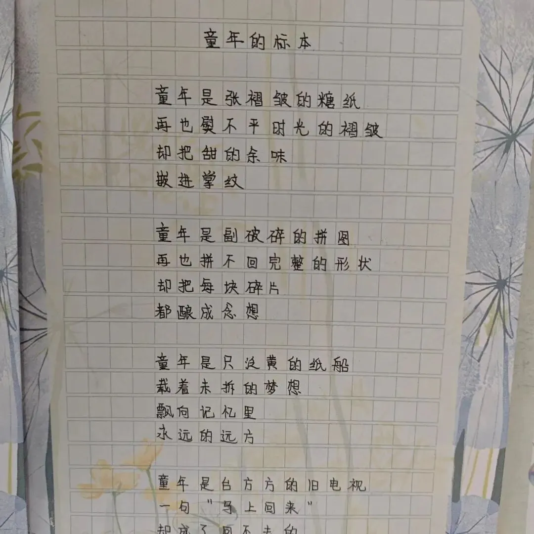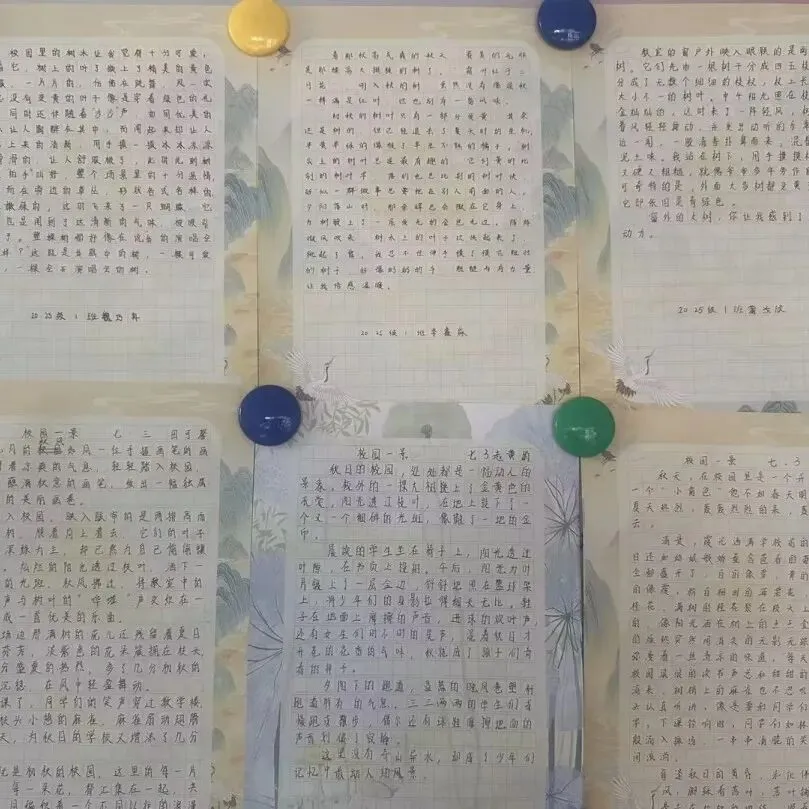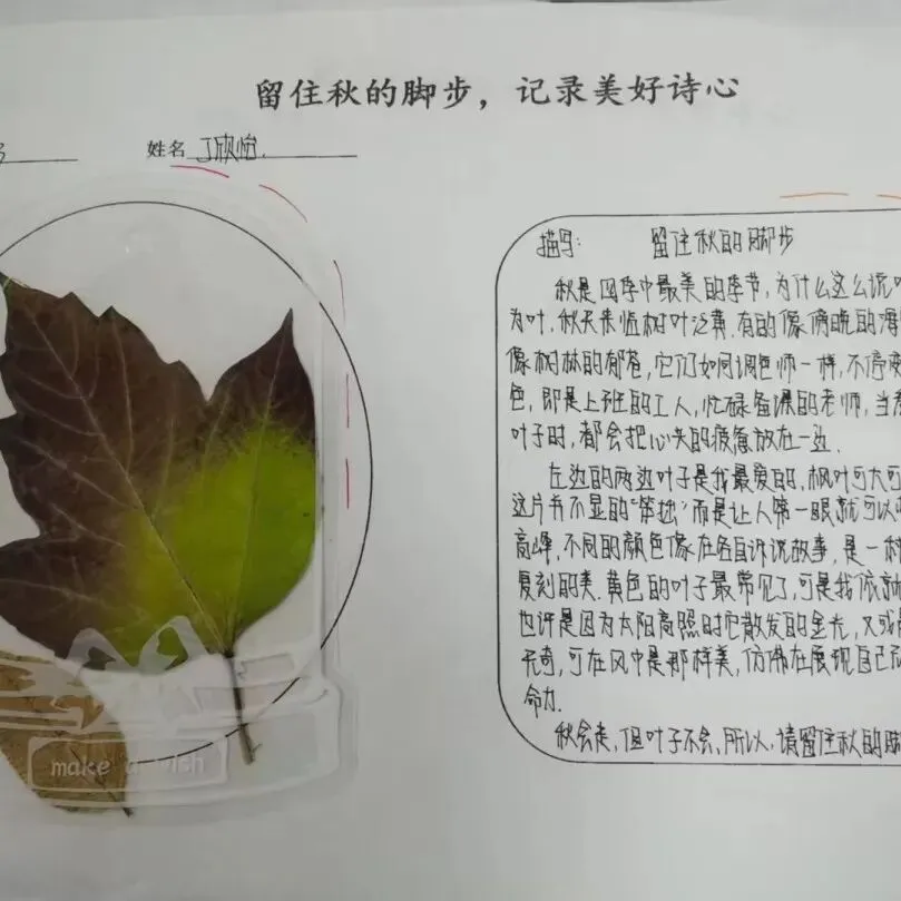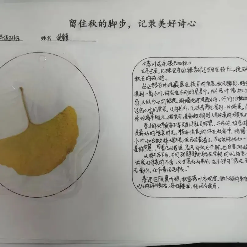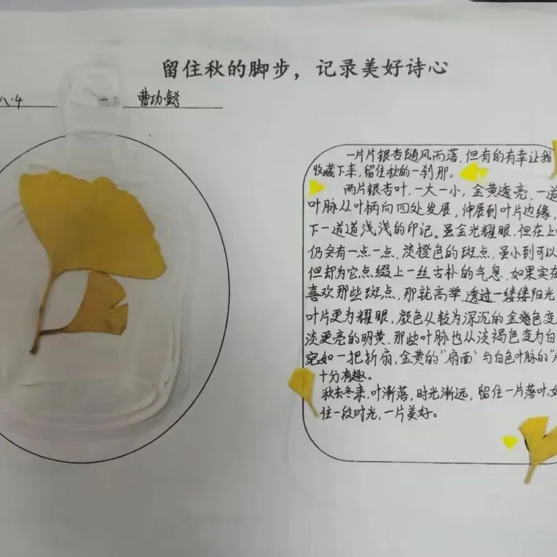 八年级聚焦“练字+创意作文”,举办“留住秋的脚步,记录美好诗心”主题活动。同学们或描摹银杏叶的金黄透亮,或细写五角枫的锯齿边缘,或借落叶抒发时光感悟,文字间满是对自然的热爱与对生活的思考。“银杏叶如折扇,叶脉如扇骨,阳光穿透时,碎金满掌”“落叶不是无情物,化作春泥更护花,这是秋的馈赠,也是成长的启示”,这些文字既有画面感,又有思想深度。