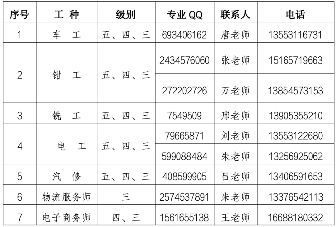 培训职业(工种):车工、钳工、电工、汽修、铣工、电子商务师、物流服务师