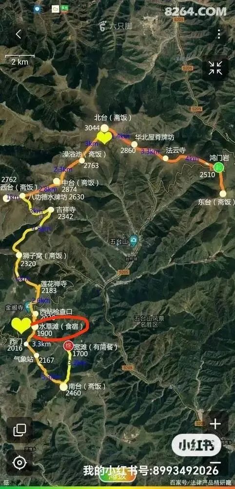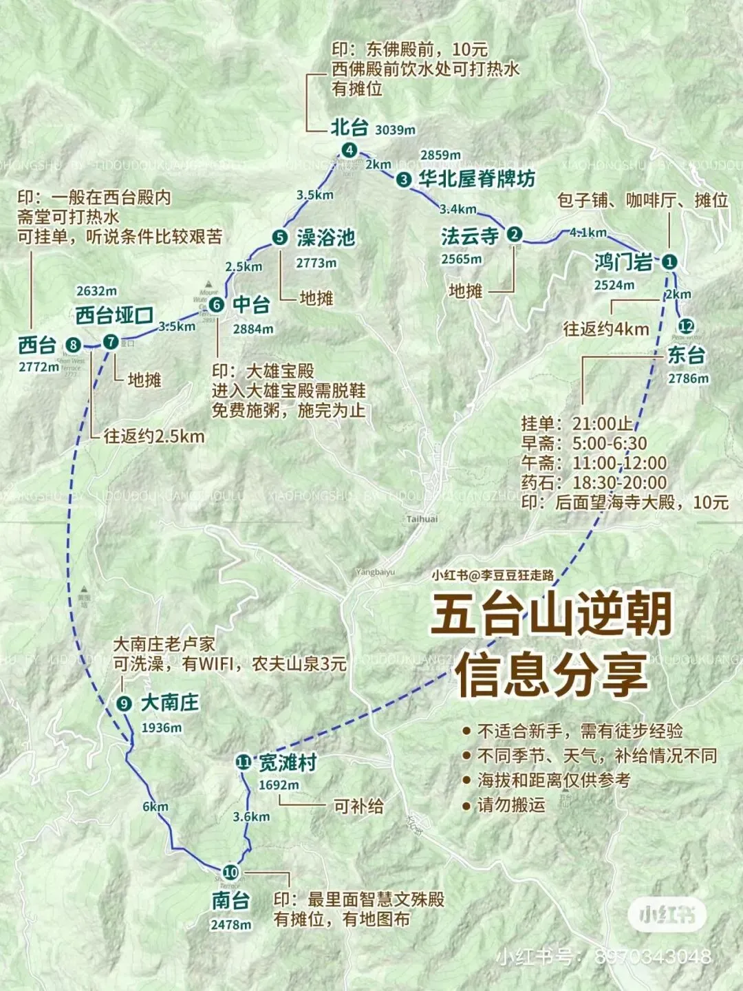 【路线简介】:五台山大朝台,全程约50多KM。各路段距离及海拔高度(仅作参考)1、鸿门岩,海拔2500米,距东台1.8KM,海拔上升246米(重复路线)2、东台望海峰,台顶望海寺,海拔2796米3、鸿门岩至法云寺,3.8KM,海拔上升59米4、法云寺至华北屋脊牌坊,3.2KM,海拔上升299米5、华北屋脊牌坊至北台顶,2.1KM,海拔上升203米6、北台叶斗峰,台顶灵应寺,海拔3061米7、北台顶至澡浴池,3KM,海拔下降295米8、澡浴池,海拔2766米9、澡浴池至中台顶,2.5KM,海拔上升124米10、中台翠岩峰,台顶演教寺,海拔2890米11、中台至西台垭口,2.7KM,海拔下降261米12、西台垭口海拔2629米13、西台垭口至西台顶,1KM,海拔上升144米14、西台挂月峰,台顶法雷寺,海拔2773米15、西台至吉祥寺,3.8KM,海拔下降423米16、吉祥寺,海拔2347米17、吉祥寺至狮子窝,4.6KM,海拔下降30米18、狮子窝海拔2317米19、狮子窝至金阁寺,5.6KM,海拔下降304米20、金阁寺海拔2013米21、金阁寺至南台牌楼,1.7KM,海拔上升15米22、南台牌楼海拔2028米23、南台牌楼至气象站,3.2KM,海拔上升163米24、气象站海拔2191米25、气象站至南台顶,3.4KM,海拔上升283米26、南台锦绣峰,台顶普济寺,海拔2474米27、南台顶至佛母洞,4KM,海拔下降533米28、佛母洞海拔1941米29、佛母洞至停车场,台阶1680级,平台56个,1KM,下降258米