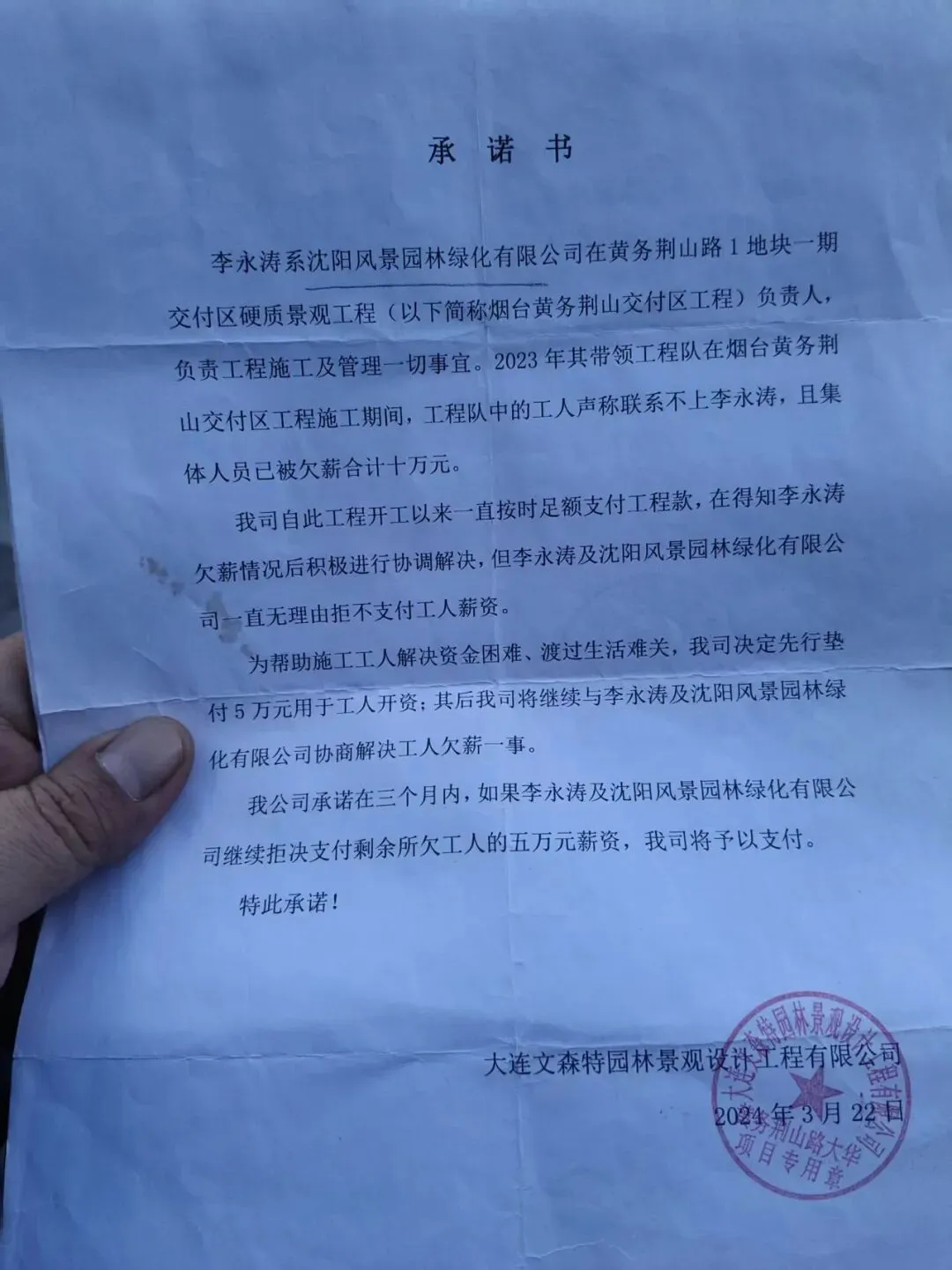 多次追讨无果后,肖某等人向总包方文森特公司求助。该公司出具加盖公章的《承诺书》,明确承诺:“三个月内若分包方李某涛及沈阳风景园林绿化有限公司拒不支付剩余5万元,则由文森特公司予以支付”,并先行将5万元垫付至工人账户。