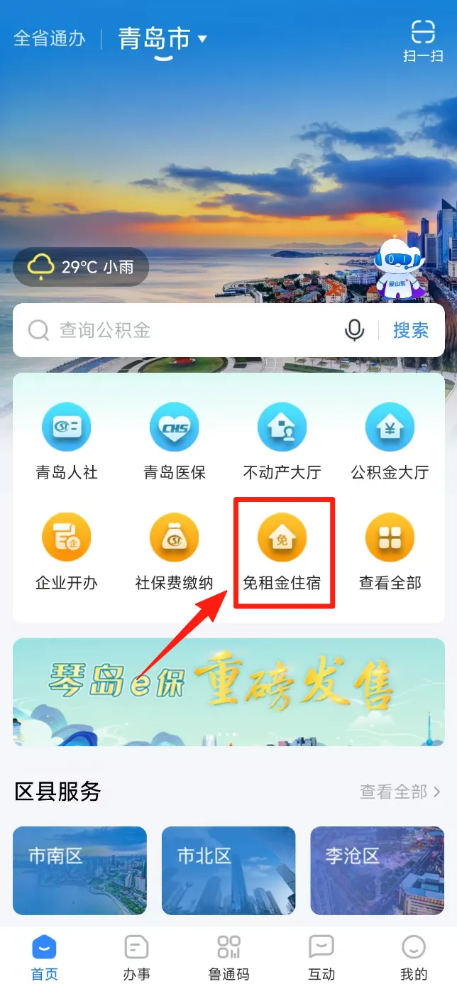 申请人通过“爱山东”APP搜索“青岛市免租金住宿保障平台”(以下简称“平台”),查看并签署个人承诺书,提交申请,线上选择免租金住宿保障住房所在社区,由平台自动分配房间。