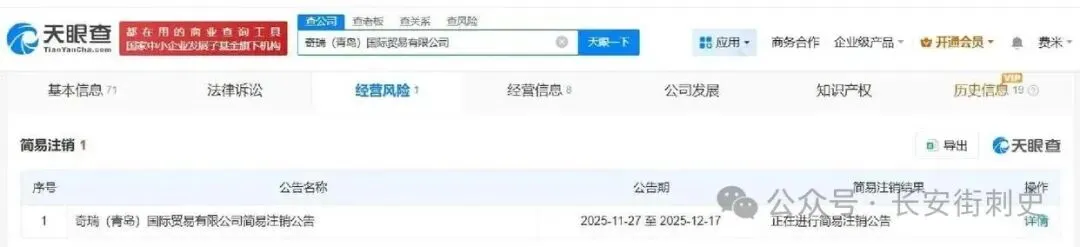 当得知奇瑞(青岛)国际贸易有限公司在2026年1月5日正式注销,我的脑海不由回想起几年前第一次看到它名字的情景。那时的我,刚好在青岛港附近参加一个汽车产业论坛,海风里夹着咸湿的味道,眼前是巨轮装载着车辆驶向远方。它的成立,被不少业内朋友当作奇瑞汽车“出海大战”的前哨兵,象征着一个新通道的开启。