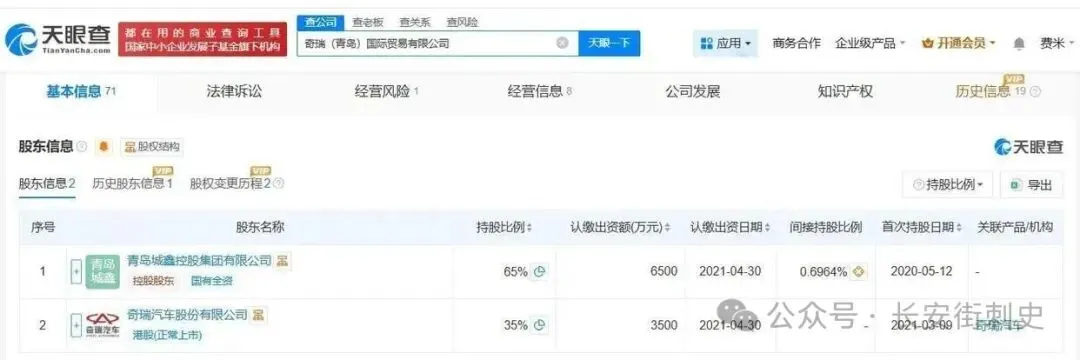 这家公司成立于2020年5月,法定代表人为崔明寿,注册资本高达1亿元,业务涵盖汽车新车销售、汽车租赁、机动车改装等。股权结构也颇有看头:青岛城鑫控股集团有限公司持股65%,奇瑞汽车股份(09973.HK)持股35%。其中,青岛城鑫控股是地地道道的地方国企,背后是青岛市国资委的间接持股。这种地方国资与自主车企的联姻,在当时人看来颇具战略意味。