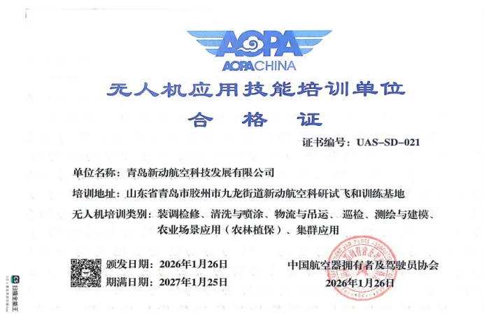 青岛新动航空科技发展有限公司,坐落于上海合作组织地方经贸合作示范区核心区,由山东泰山产业领军人才王宝广联合航空航天领域专家团队创立,现有专兼职人员120余人,已获批山东省级新型研发机构。公司核心业务包括工业级无人机等智能装备的研发、制造、销售、培训,以及低空经济场景应用。依托青岛市智能无人飞行器研发制造技术创新中心等优质平台,构建起“研发-制造-培训-应用”一体化特色培训体系,致力于成为国内工业无人机行业应用的领军者与系统解决方案的优质供应商。