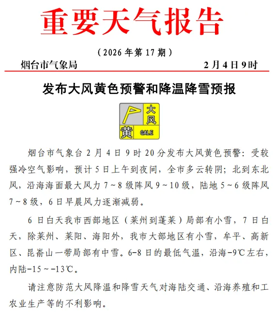 6日白天我市西部地区(莱州到蓬莱)局部有小雪,7日白天,除莱州、莱阳、海阳外,我市大部地区有小雪,牟平、高新区、昆嵛山一带局部有中雪。6-8日的最低气温,沿海-9℃左右,内陆-15~-13℃。