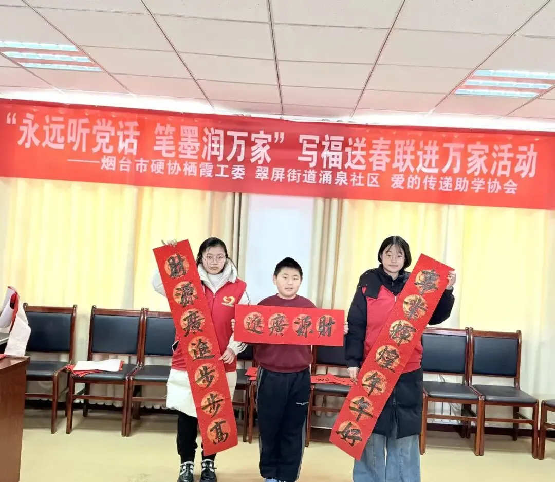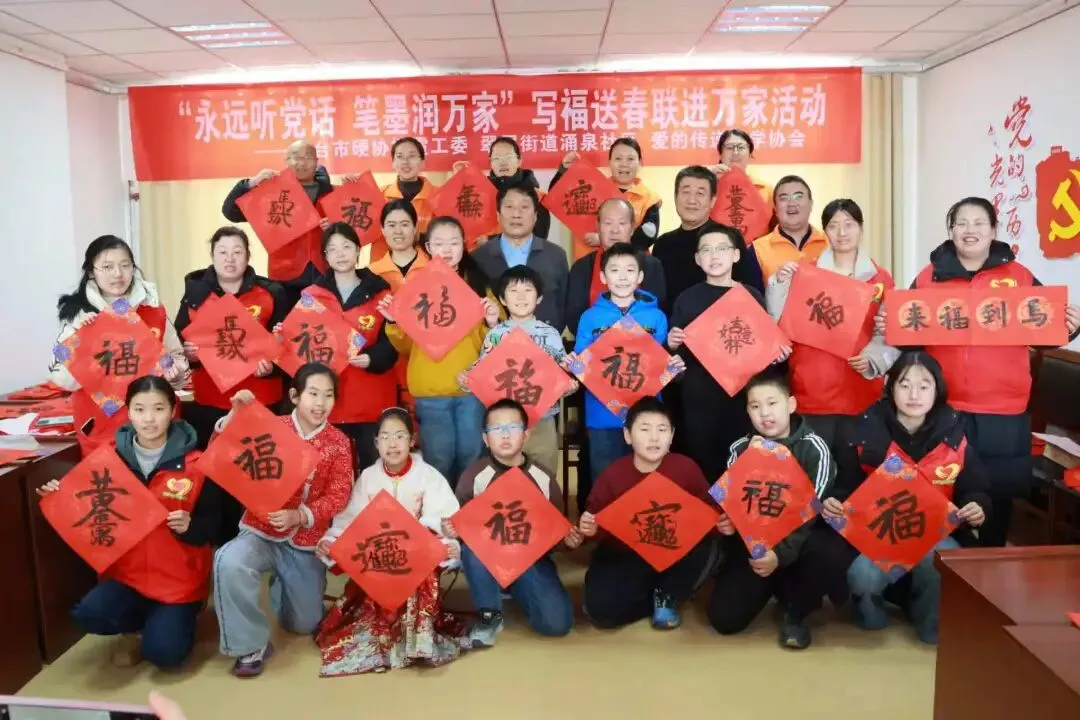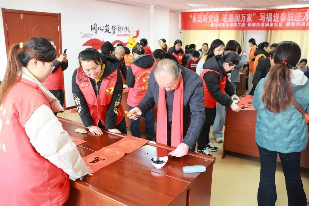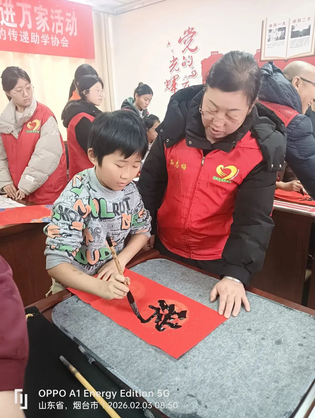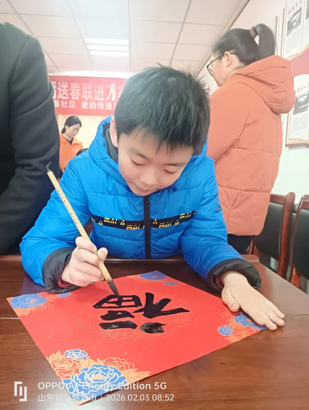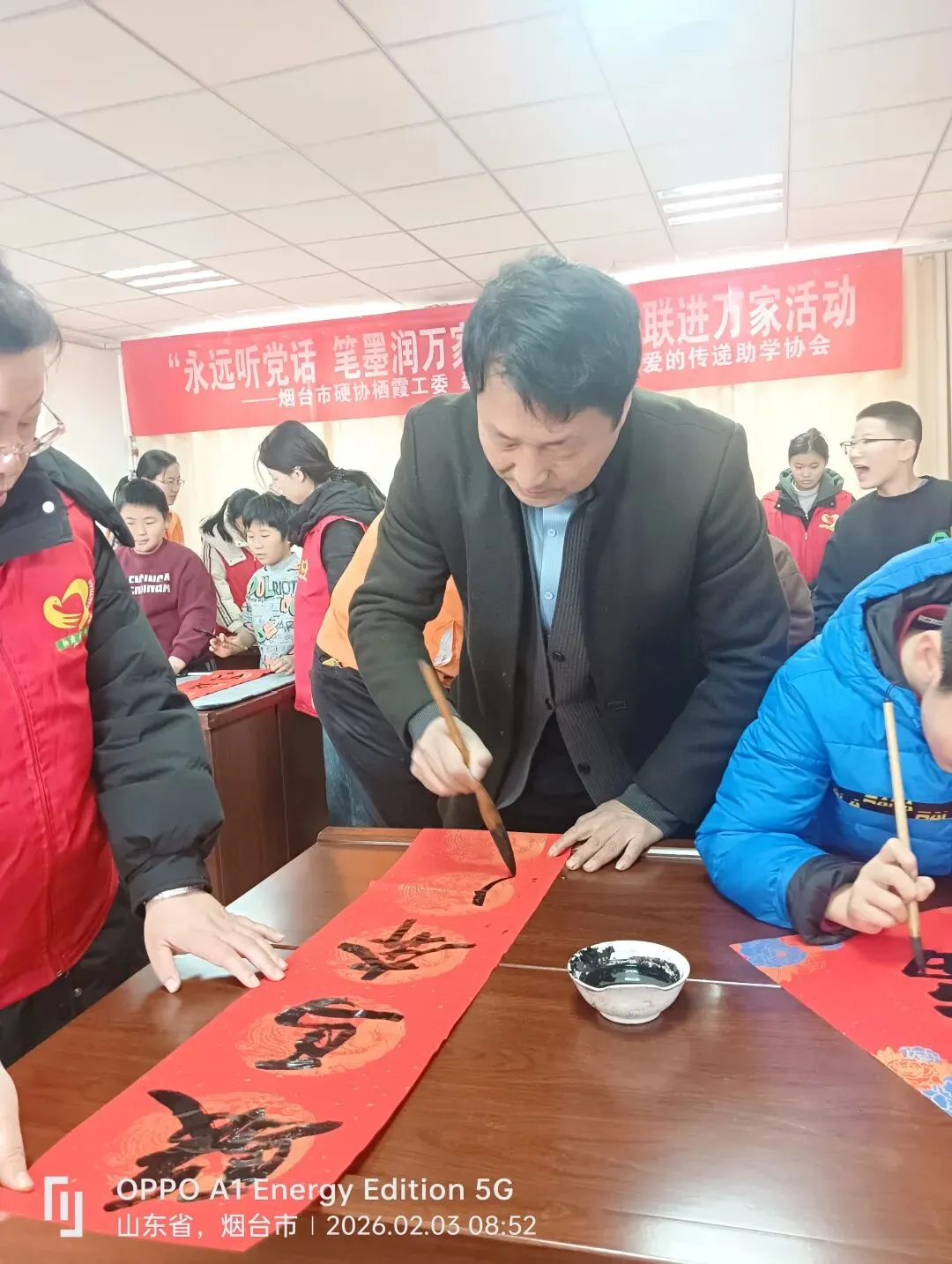 腊月十六,岁寒愈暖,年味渐浓。烟台市硬笔书法家协会栖霞工委在主席吴德生带领下,携副主席董志豪、牟洪详、连仁良及少儿书法会员新锐林相宇、董奕麟、潘彦成、曲昊天、王博、林煜佳、杨悦、宋梦瑶、王禹翔等十余名骨干力量,走进栖霞市翠屏街道涌泉公寓,联合栖霞市爱心捐助协会,开展“写福字·送春联”新春公益惠民活动,以实际行动践行“永远听党话,笔墨润万家”的初心使命。