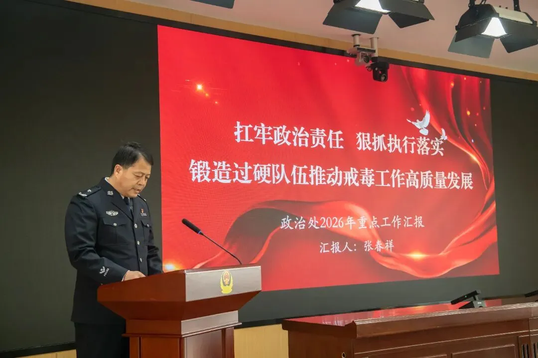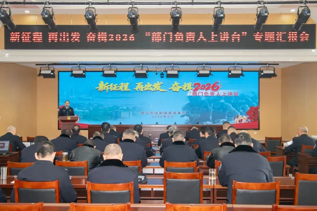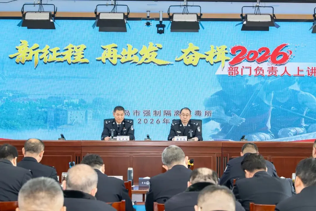 为深入贯彻省司法厅、市司法局关于加强司法行政队伍建设重要会议精神,全面提升戒毒工作系统化、专业化水平,确保新的一年工作谋好篇、开好局、起好步。 2月4日,青岛市强制隔离戒毒所举办以“新征程,再出发 奋楫2026”为主题的“部门负责人上讲台”专题汇报会。所党委副书记、政委黄聿伟主持会议,所党委书记、所长张光京讲话。所党委成员、各部门副处级以上领导干部以及部分群众代表参加会议。