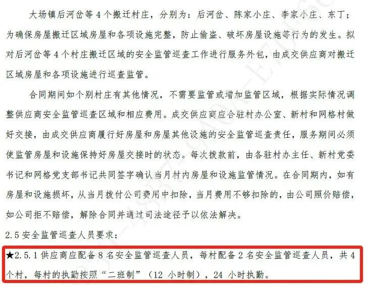 1. 人员配备:供应商需配备8名安全监管巡查人员,每村2名,实行“二班制”(12小时制),确保24小时全天候执勤;