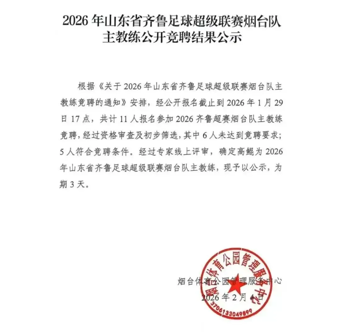 公示|2026齐鲁超赛烟台队主教练公开竞聘结果公示