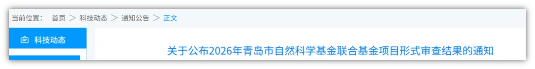 根据2026年青岛市自然科学基金联合基金项目评审工作要求,经主管单位推荐、形式审查等程序,现将形式审查结果予以公布。各有关主管和申报单位、申请人可自行登录https://qdkjj.qingdaokjjr.com:8082/portal/#/login,在科技计划项目模块,点击“结果公布及公示”进行查看。通过形式审查的项目,状态栏显示“形式审查通过”。公布时间为 2026年2月3日至2月5日。