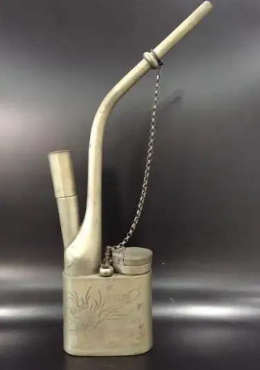 据考查,我国吸食烟具的材质有金、银、铜(黄铜、白铜)锡、竹木等。拥有金银材质烟具的人物,只有解放前的大地主、大资本家、名门贵族才有。贫民百姓,只能使用铜质、竹木质普通烟具。