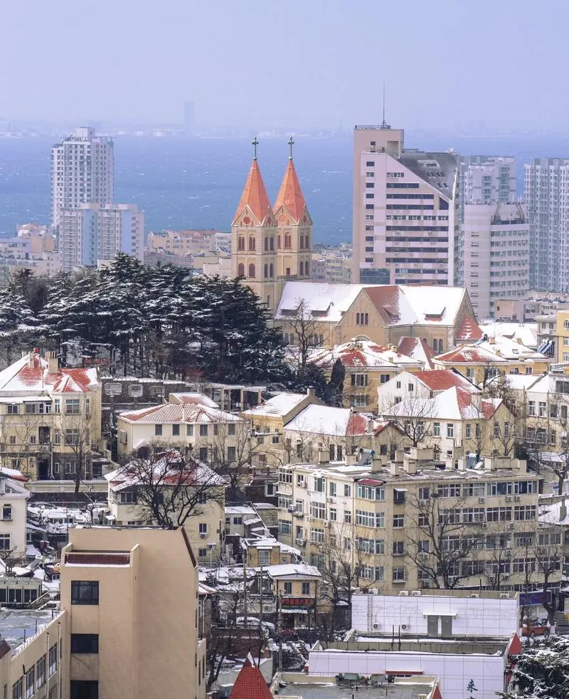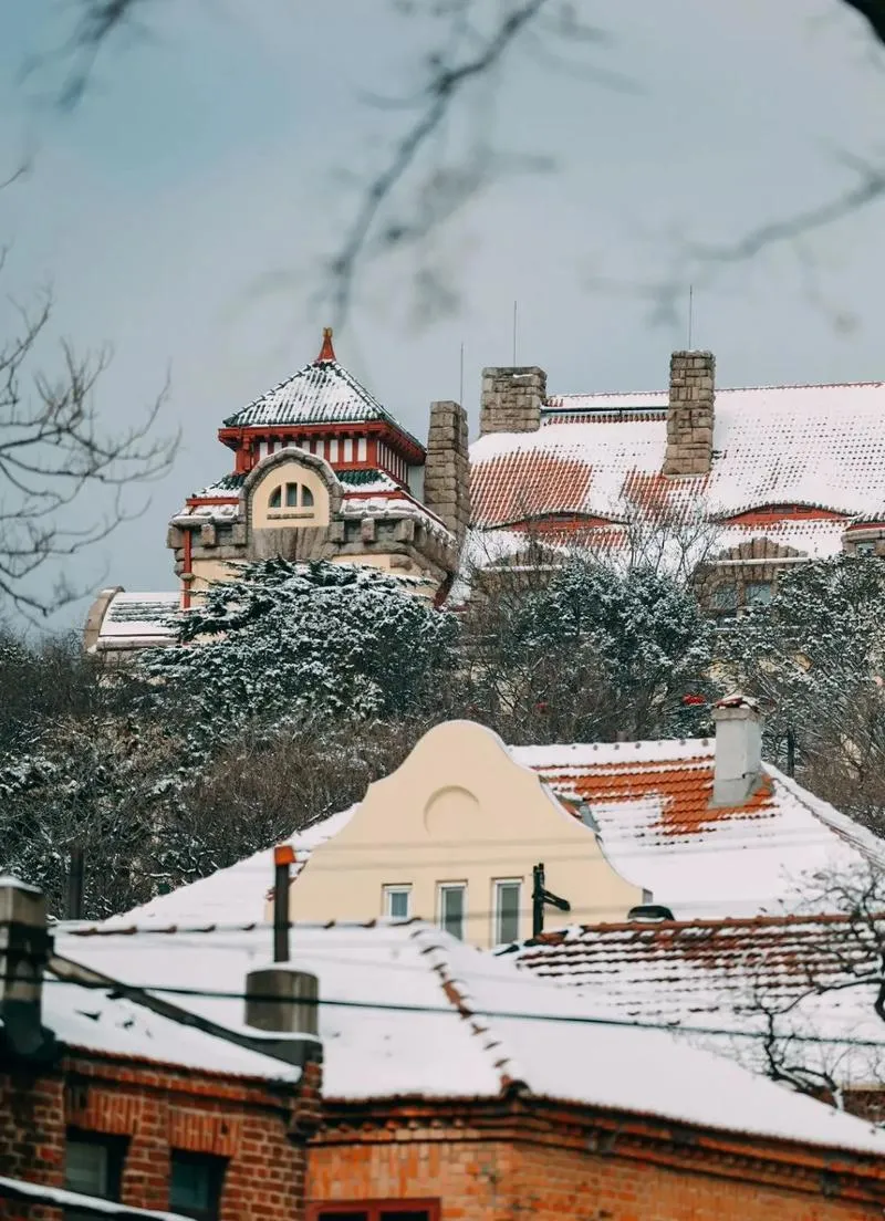 大多数海滨城市,你去了就是看海,建筑是建筑,海是海,雪是雪,各是各的,但青岛不是,青岛的雪落下来之后,红瓦会被白雪盖住一半,露出一半,那种红白交织的视觉冲击,配上远处灰蓝色的海,整个城市一下子就变成了一幅油画,不是那种刻意营造出来的美,是一种自然生长出来的、恰到好处的美。你站在八大关的某个路口,看着积雪压弯了法桐的枝条,石板路上铺着薄薄一层雪,远处能看到海天一线,那一刻你会突然明白,青岛这个城市,从一开始就不是为了展示什么,而是为了生活。