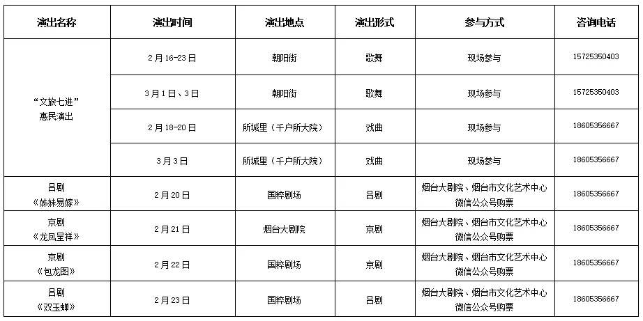 碧海仙山逢新岁,艺苑琼枝绽芳华。马年到来之际,烟台市文化艺术中心诚邀您共赴“新春艺术盛宴”,让诗意乐章在舞台流转,让浪漫山海与艺术交响,让您度过一个精彩纷呈又温馨难忘的春节假期。演出名称:“文旅七进”惠民演出(歌舞)