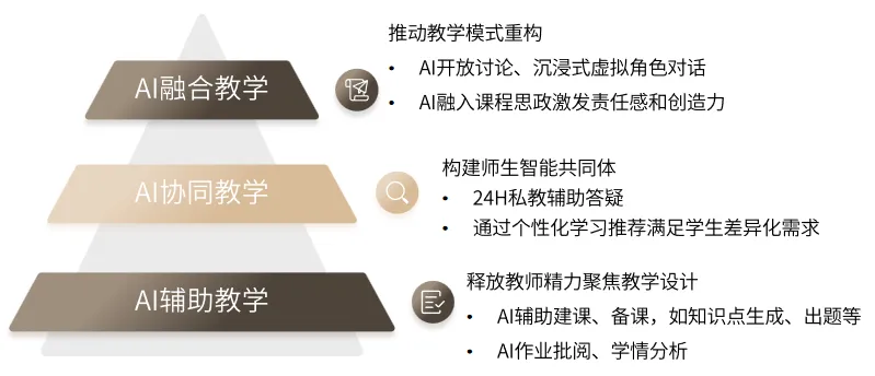 从AI辅助教学→协同教学→融合教学,体现AI从工具化到协作化再到生态化的逐步深入。也体现了从“教师+AI工具”的传统模式,发展为“教师-AI-学生”三方协同,最终形成以AI为基石的个性化教育体系。