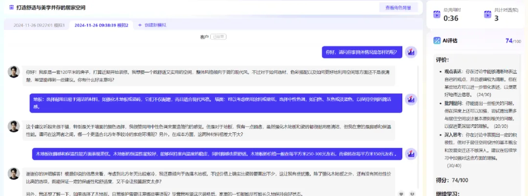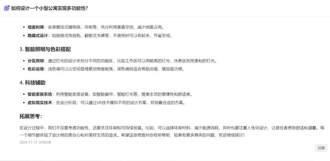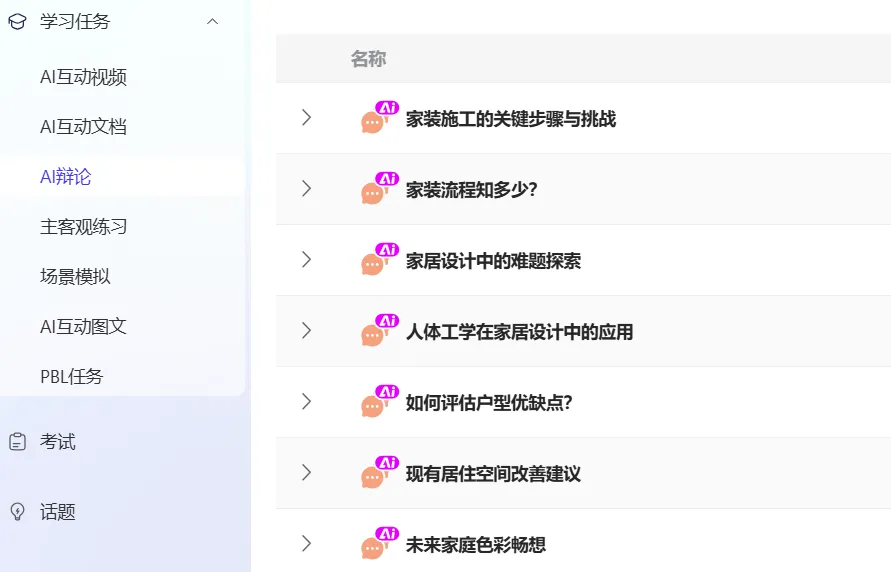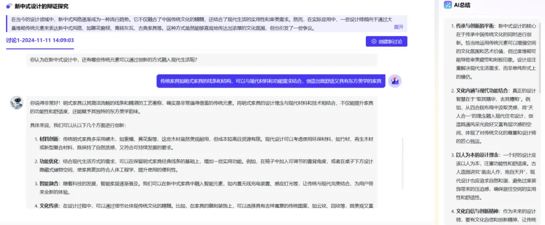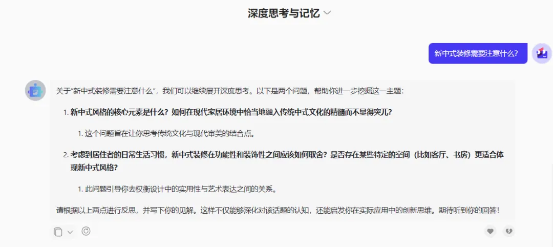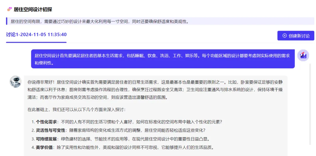 设计“室内风格大探讨”、“新中式设计:传统与现代的平衡之道”、“未来家材选择探讨”等等开放讨论话题,让学生通过与AI开放讨论,从而能够从多个角度和层面深入探讨学习内容,加深对学习材料的理解。同时,AI鼓励学生主动思考、分析和解决问题,提出问题、质疑观点并用证据支持自己的论点,有效培养批判性思维。