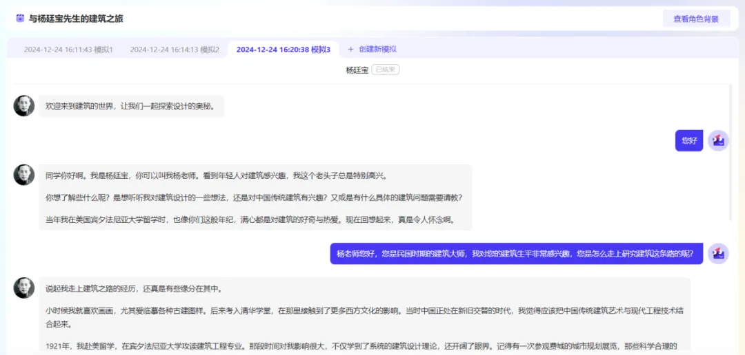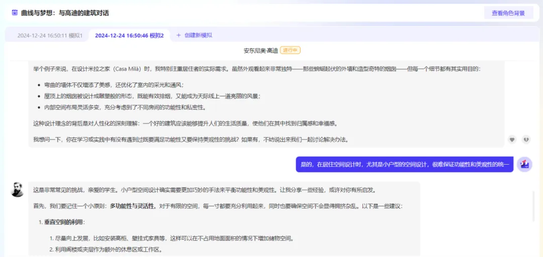 通过模拟与杨廷宝、安东尼奥·高迪等伟人的对话,学生能够体验AI技术模拟角色的体验感,增强学习兴趣和参与度,提供沉浸式学习体验,感知AI技术与时空的交融,够激发学生的学习兴趣,让学生更加主动地参与到课堂学习中来。
