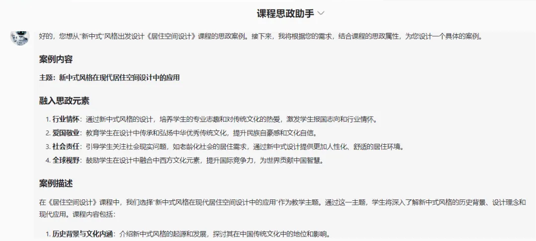 将课程思政(例如:工匠精神、民族自信、制度自信、合作意识、团队精神、自然与社会和经济和谐发展、对模糊随机环境的抗压能力等)融入AI教学设计。如“与杨廷宝先生的建筑之旅”模拟讨论可以激发学生对建筑设计应用的思考,鼓励他们在尊重传统的基础上创造出新的文化表达形式。