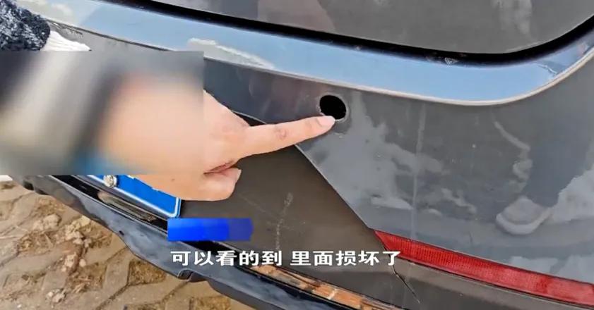 回家后,陈女士仔细检查车辆,发现受损并不轻:“雷达的钮掉了,里面也坏了,车保险杠裂了、掉了漆,摄像头直接被撞下来了,送到4S店修估计得两三千块。”