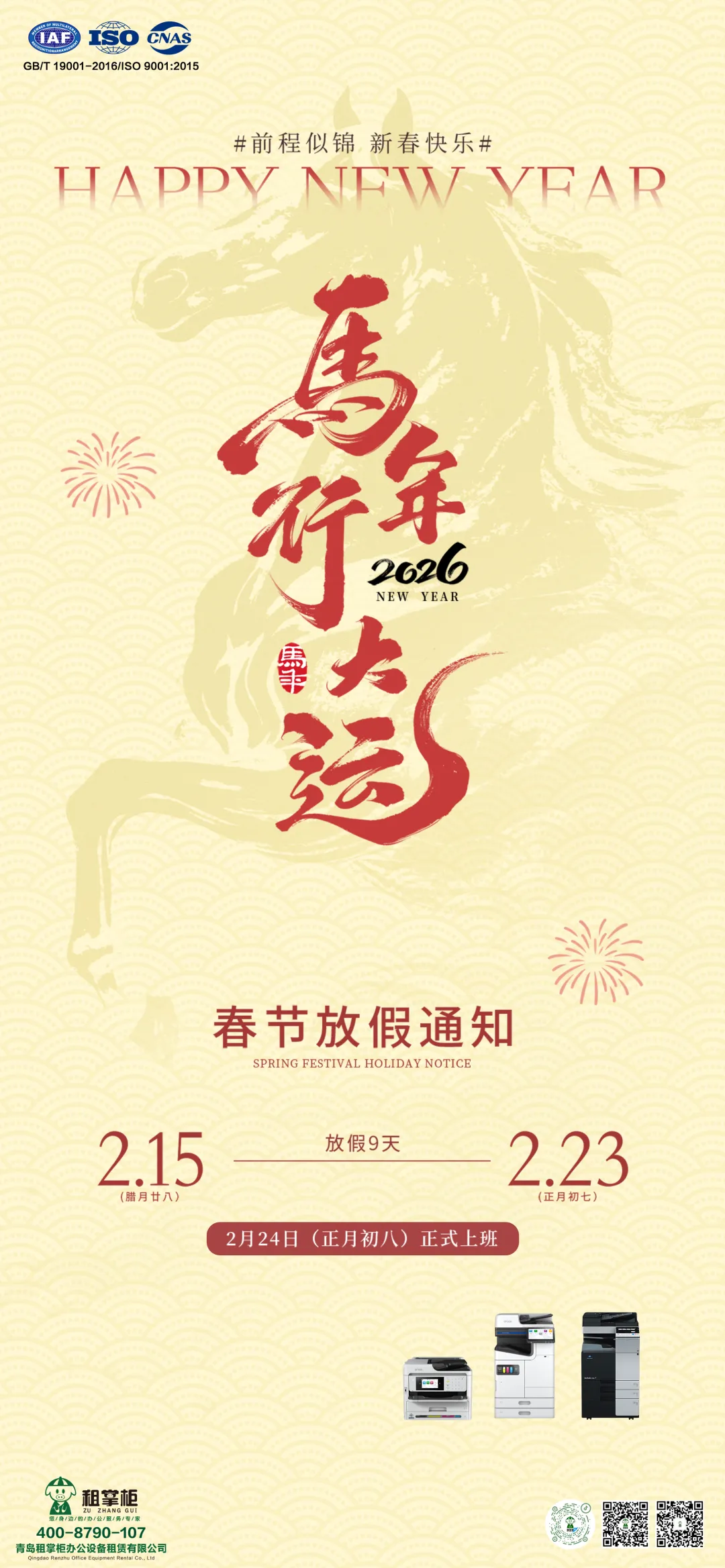 青岛租掌柜2026年春节放假通知:致谢2025,马年“印”享未来!