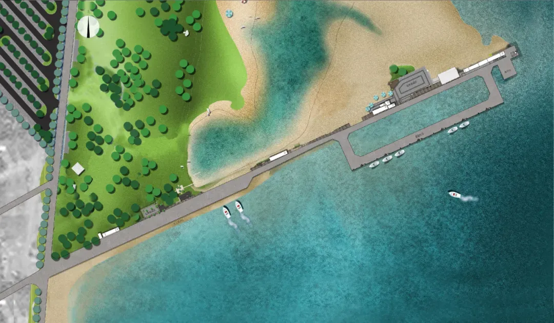 位于东段海水浴场南侧,紧邻优质沙滩资源,4300㎡商业空间可打造集休闲垂钓、海上观光、特色餐饮、文创零售于一体的主题码头。