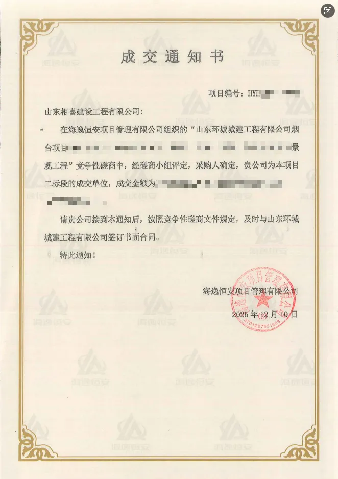 在海逸恒安项目管理有限公司组织的“山东环城城建工程有限公司烟台项目景观工程”竞争性磋商中,经磋商小组严格评定、采购人最终确认,我公司成功中标本项目二标段 ,成为该标段的成交单位!