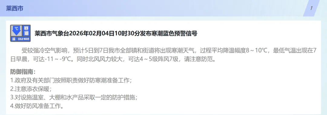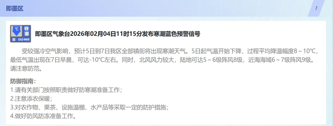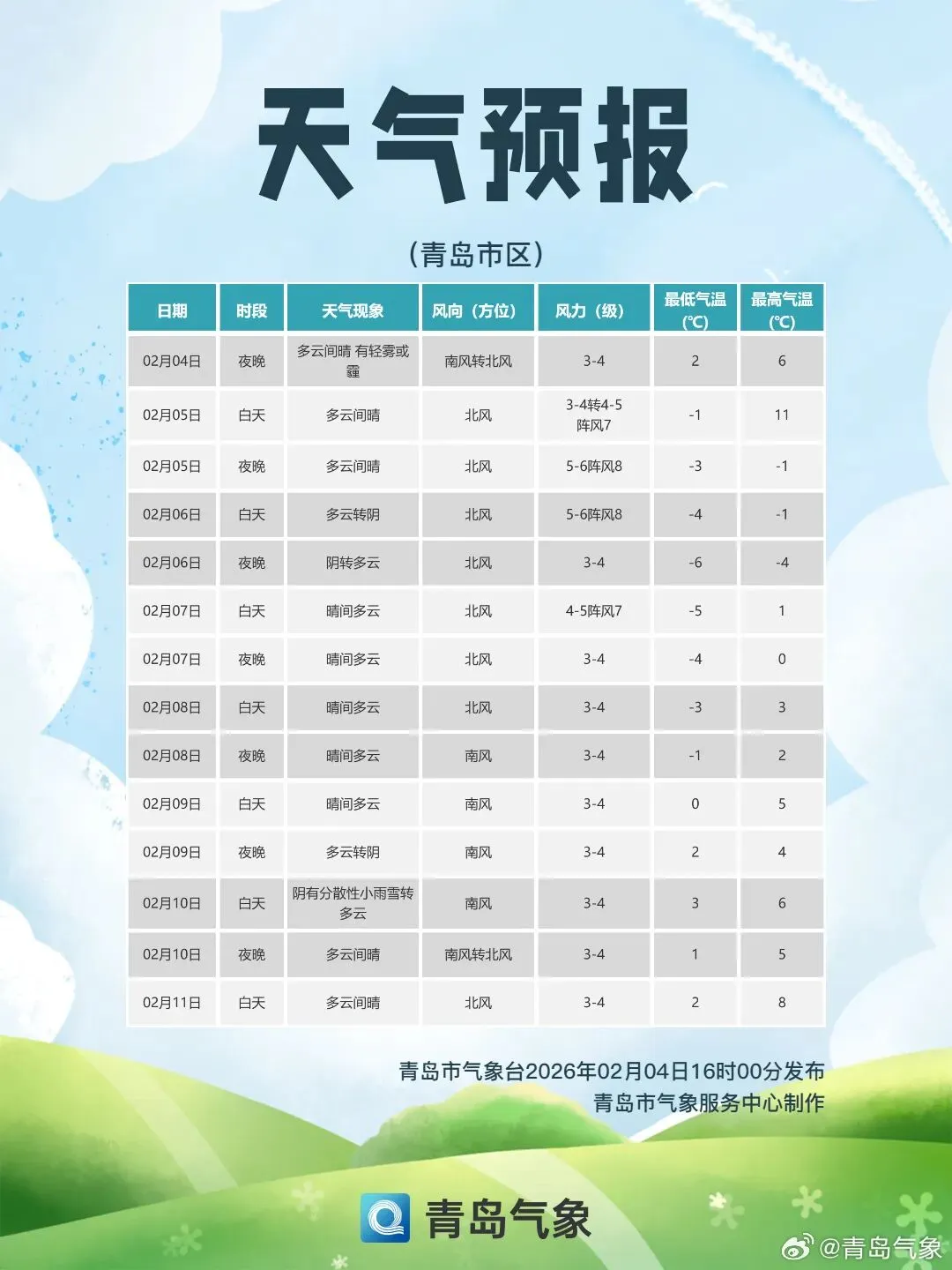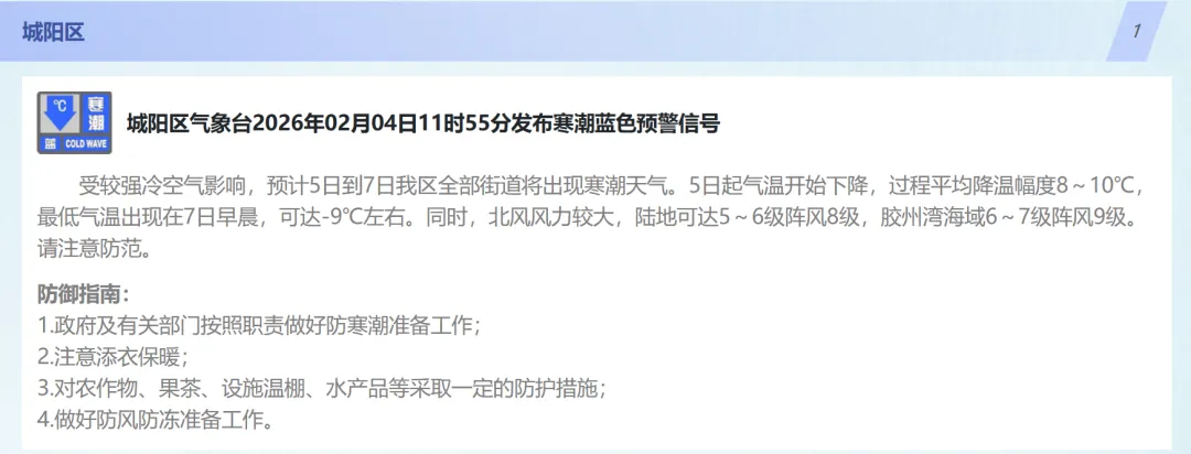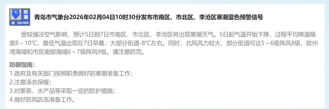 2月5日,较强冷空气开始影响青岛,北风风力逐渐增大,5日夜间起气温明显下降。预计5~7日,全市过程降温幅度8到10℃,预计最低气温出现在7日早晨,其中沿海地区-6~-9℃,内陆地区-11℃左右,气温降幅大并伴有大风,提醒大家要注意防风保暖。【青岛市区】5日白天,多云间晴,北风3到4级转4到5级阵风7级,相对湿度40%~90%,5日最低气温-1℃,最高气温11℃。5日夜间到6日白天:多云转阴,北风5到6级阵风8级,-4到-1℃。6日夜间到7日白天:阴转晴,北风3到4级转4到5级阵风7级,-6到1℃。【预报各区】4日夜间到5日白天,多云间晴,局部有雾或霾,南风转北风,海上,5到6级转6到7级阵风9级,内陆,3到4级转4到5级阵风7级,5日最低气温-4℃,最高气温12℃。5日夜间到6日白天:多云转阴,北风4到5级阵风7级。6日夜间到7日白天:阴转晴,北风3到4级转4到5级阵风7级。●来源:半岛都市报(bandaobao)综合、@青岛气象