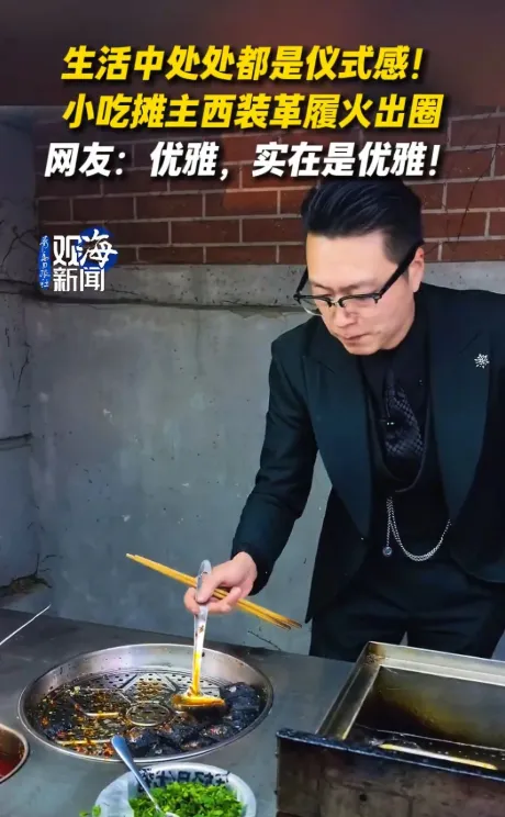 穿西装出摊,是遵从自己的喜好,也是给生活添点仪式感。哪怕摆摊的洗护成本高了些,他也觉得,自己打扮得精神,顾客的心情也会更舒畅。这份随性又认真的生活态度,打动了不少人,越来越多的顾客特意慕名前来打卡,就想尝尝这位“西装大叔”做的臭豆腐,再和这位有格调的摊主聊上几句。