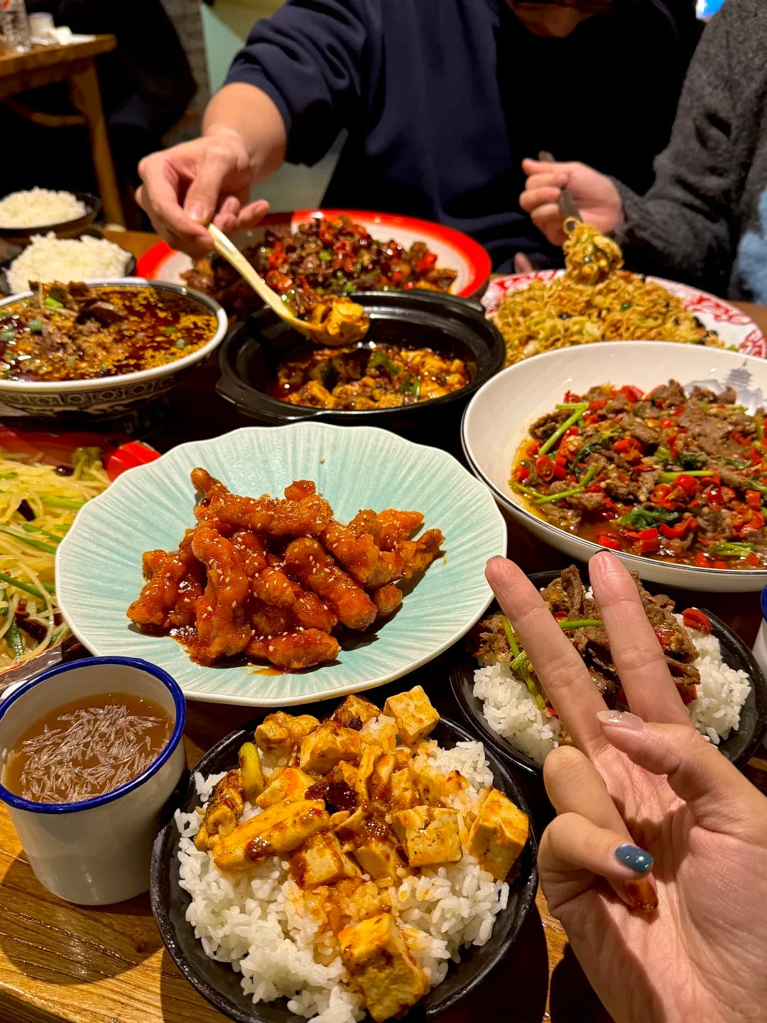 一道推荐:朝天锅。做法其实简单:大铁锅架在炉上,铺豆腐皮、花干、肉片,再加上葱段、姜片,老汤滚起来后慢慢炖着,肉不散、汤清亮。几个人围着坐,像守着一场温吞的日子。