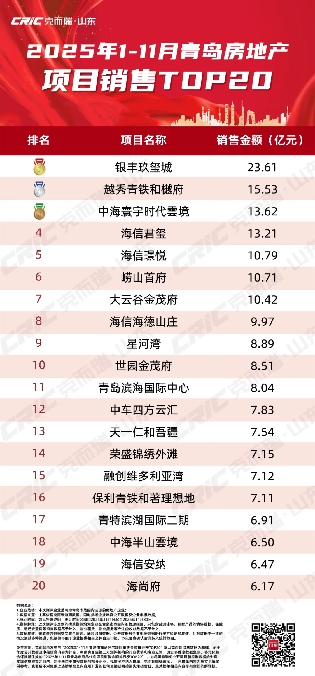 本次克而瑞青岛发布的2025年1-11月青岛房企销售排行榜,用数据来呈现房企的业绩表现: