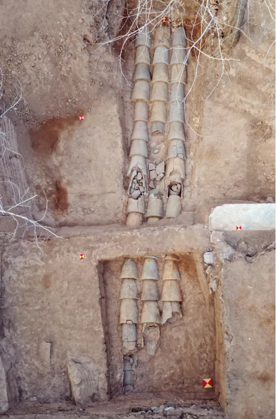 首次在山东地区发现时代明确的秦代窑址。窑址区位于山下西南部,邻一条南北向冲沟。发掘区内发现10座半倒焰窑,均由操作间、火膛、窑床和烟道构成。冲沟内发现一道东西向条形夯土蓄水堤坝。发掘出土的大量秦代建筑类遗物,具有重要的年代学意义。窑址的发现不仅为遗址断代和分期提供了准确依据,还充分展现了中央集权下资源调配与标准化生产制度。