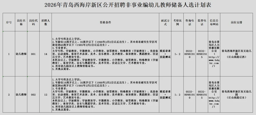 根据学前教育发展需要和招聘有关规定,2026年青岛西海岸新区面向社会公开招聘非事业编制幼儿教师储备人选26人,委托青岛市黄岛区人力资源有限公司组织,现公告如下: