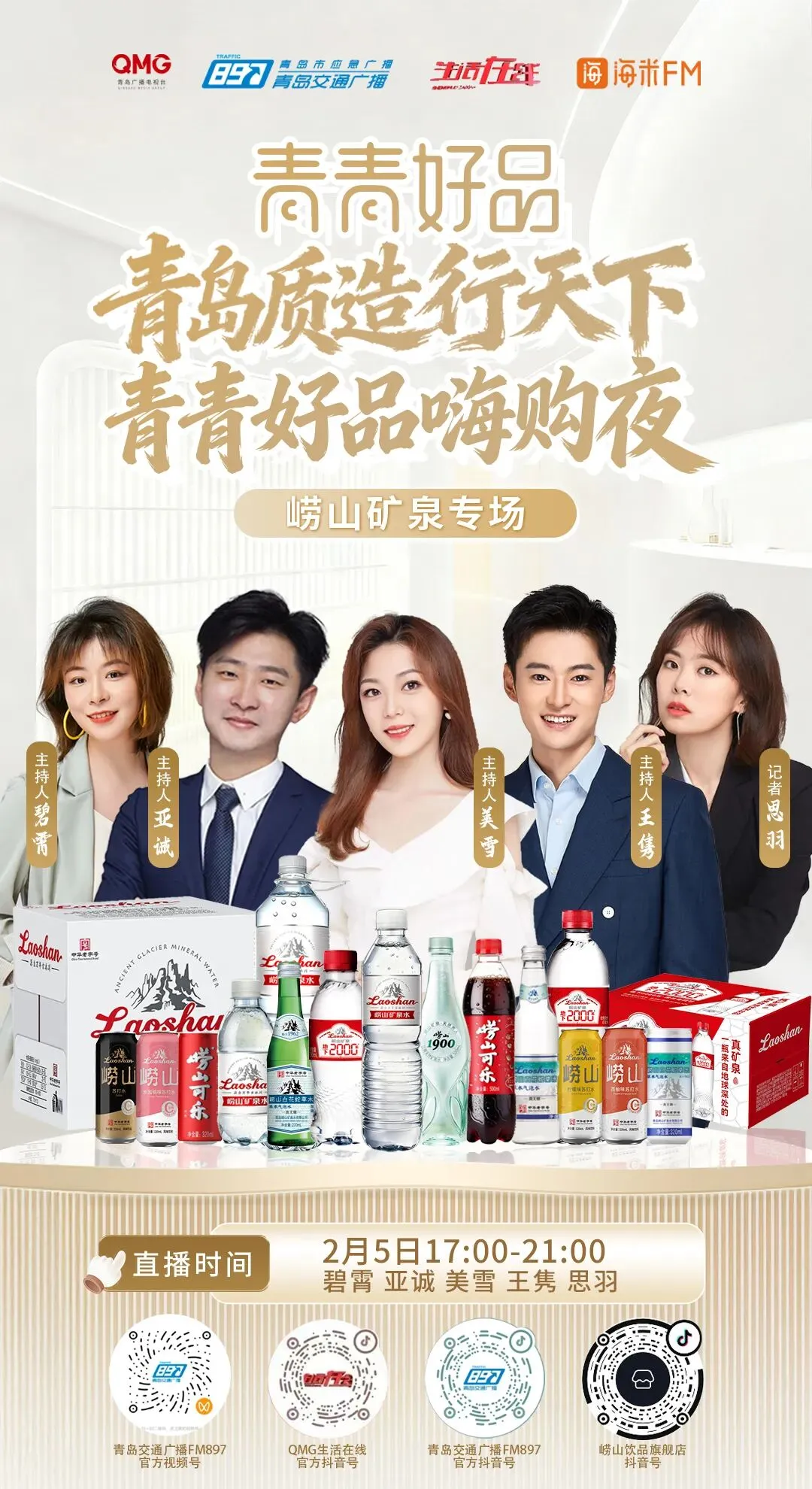 “青岛质造行天下”系列直播持续升温,今天专场全新阵容,美味升级!2月5日(周四)下午5点,“青青好品”直播间将迎来超强主播新阵容:《生活在线》主持人王隽、记者思羽,《一起旅行吧》主持人美雪,联袂交通广播897主持人亚诚、碧霄带来崂山矿泉专场,共同为您推荐青岛饮品的标杆。传奇的白花蛇草水、温润的崂山可乐、经典的1900矿泉水,“崂山三绝”一次拥有。我们的主播将与专家一起,带你深入崂山品牌126年的历史长廊,揭秘一瓶好水背后的匠心故事,分享健康饮水的智慧。下午5点,锁定任一平台,我们云端相聚,共享健康美味!我们尊重原创,也注重分享。本公众号未注明来源的稿件,均为青岛电视台内部版权,若需转载请联系我们;其它凡本公众号注明“来源”的作品、图片,均转载自其他媒体、网络,转载目的在于传递更多信息,仅供学习参考之用,版权归原作者所有,禁止用于商业用途,如无意中侵犯您的知识产权,请联系删除,本公众平台将不承担任何责任。