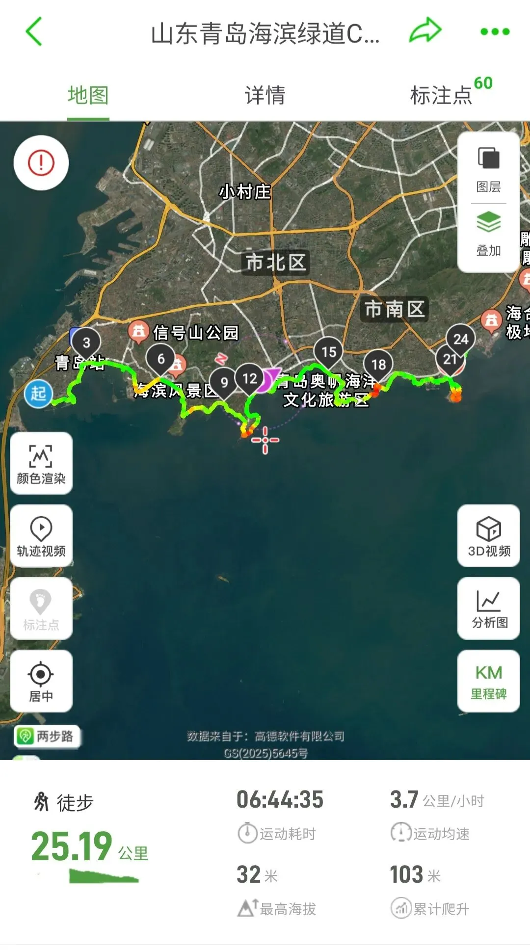 山东青岛海滨绿道Citywalk 25公里,从八大峡附近一路走到小麦岛,如果算上在老城区的小巷穿行和沿海岸线的绕行,实际路程确实接近25公里。路线概览路线:八大峡广场 → 栈桥 → 老城 (中山路/教堂) → 小青岛 → 鲁迅公园 → 八大关 → 第二海水浴场 → 太平角 → 第三海水浴场 → 五四广场 → 奥帆中心 → 燕儿岛公园 → 海之恋公园 → 小麦岛公园距离:约 23–26 公里用时:7–9 小时 (含拍照和休息)难度:⭐⭐⭐ (对体力有一定要求)🗺️ 分段详解第一段:八大峡 → 栈桥 (约 2 km | 30 分钟)从八大峡广场出发,沿着西陵峡路的堤坝向东,这里是本地人常去的钓鱼点。随后转入太平路,路过海上皇宫后,远远就能望见回澜阁的剪影,抵达栈桥东端。此段为全程最经典的“海上开场”。冬季海鸥很多,一路伴随。第二段:栈桥 → 老城核心 (约 3 km | 40-50 分钟)从栈桥返回至青岛站附近,可选择以下两条小巷穿行,体验老城风情:经典线:途经中山路、天主教堂,再从浙江路或安徽路绕回海边。文艺线:途经广西路、莒县路、湖南路,感受更安静的街区。这段路程虽短,但岔路多,建议使用地图导航。第三段:老城 → 小青岛 → 鲁迅公园 (约 2.5 km | 35-45 分钟)沿海岸线向东,经过小青岛公园和琴屿路 (网红S弯公路),随后进入鲁迅公园。这段路非常适合拍照,礁石、海浪与红礁海岸相映成趣。若时间充裕,可进入青岛海底世界参观。第四段:鲁迅公园 → 八大关 → 第二海水浴场 (约 3 km | 40-50 分钟)从鲁迅公园沿海边石板路向东,便进入“万国建筑博览会”八大关。建议沿海边栈道行走,依次经过花石楼、公主楼等。随后下至第二海水浴场,这里的礁石海岸是观赏日落的绝佳地点。第五段:第二海水浴场 → 太平角 → 第三海水浴场 (约 4 km | 1 小时)离开二浴,进入太平角公园。推荐沿海边的太平角滨海绿道绕行,人少景美。途中会经过第三海水浴场,沙滩与城市天际线同框,是拍摄“城市剪影”的好地方。第六段:第三海水浴场 → 五四广场 → 奥帆中心 (约 3.5 km | 45-60 分钟)沿东海西路向东,路过五四广场的“五月的风”雕塑,随后进入奥帆中心。这里可以欣赏到帆船港和远处的浮山湾城市景观。第七段:奥帆中心 → 小麦岛 (约 5-6 km | 1.5-2 小时)奥帆中心 → 燕儿岛公园:沿澳门路向东,转入燕儿岛路旁的滨海步道,人少安静。燕儿岛公园 → 海之恋公园:继续向东,会经过海之恋 Park,这里有白色栏杆和爱心装置,是热门的日落观景台。海之恋 Park → 小麦岛公园:最后一段约1.5公里,穿过住宅区的小路即可抵达。岛上草坪开阔,有“孤独的树”等网红打卡点,是观赏日落的绝佳位置。🎒 装备补给:穿着防滑的运动鞋,夏季注意防晒,春秋季备好防风外套。建议携带1.5-2L水和少量能量零食。路上有点补给。🚇 交通接驳:起点:可乘地铁3号线至青岛站,步行至八大峡。终点:从小麦岛公园打车返回市区较为便捷或附近地铁回城。📸 拍照节奏:老城、八大关、第二海水浴场、奥帆中心、小麦岛是拍照热点,建议在每个区域预留20-30分钟,避免全程赶路。小麦岛适合闲逛打卡。