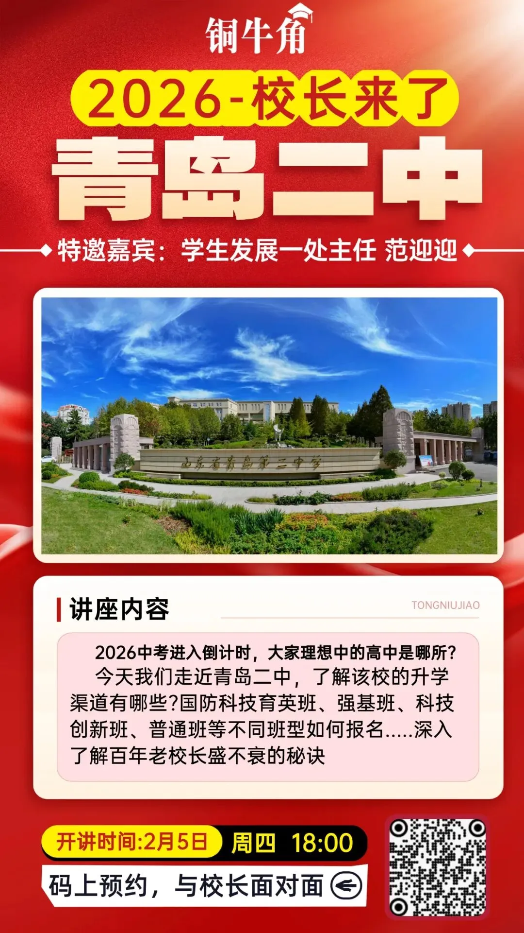 2026年中考进入倒计时,铜牛角邀请如下学校招生负责人进入直播间,欢迎大家关注:
