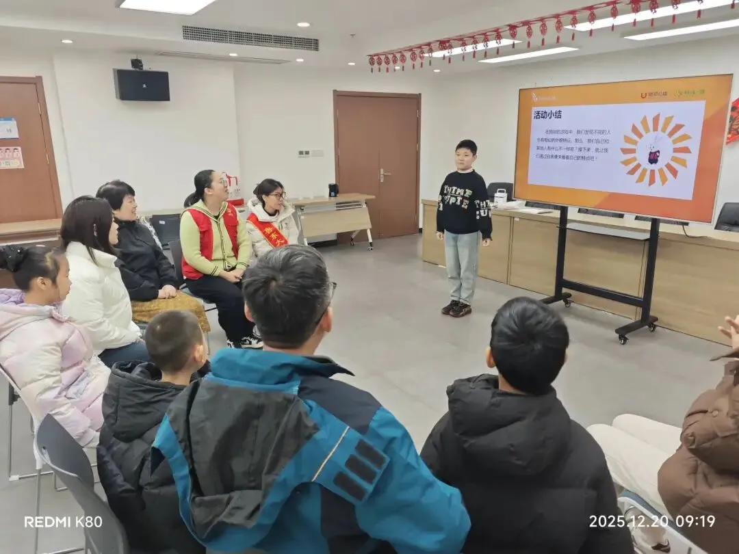 驻园组织烟台市微泉青少年事务服务中心,开展节前未成年人心理健康线下课程,以“这就是我” 、“大风吹” 游戏、“我有很多可能性”等多种主题活动,引导孩子在双向视角中强化自我认同,感受家庭关爱,帮助亲子学会科学调节情绪、建立良性沟通。家长们纷纷表示对孩子情绪表达有了全新认知。孩子们也表示,更好的认识了自我,接纳了自己的情绪。