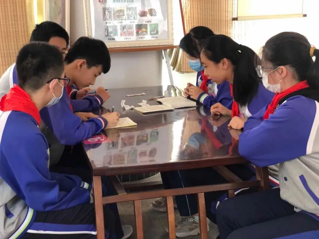 接下来,小记者们找到了七(3)中队辅导员王峰老师,当时他正在办公室里给队员们批改作业。